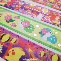 Washi is a special kind of tape that is light enough to remove without tearing paper, but it's strong enough to seal envelopes and decorate bed frames. These two designs feature shiny gold foil accents. The Red Festival washi has over 40 characters hidden throughout its design!